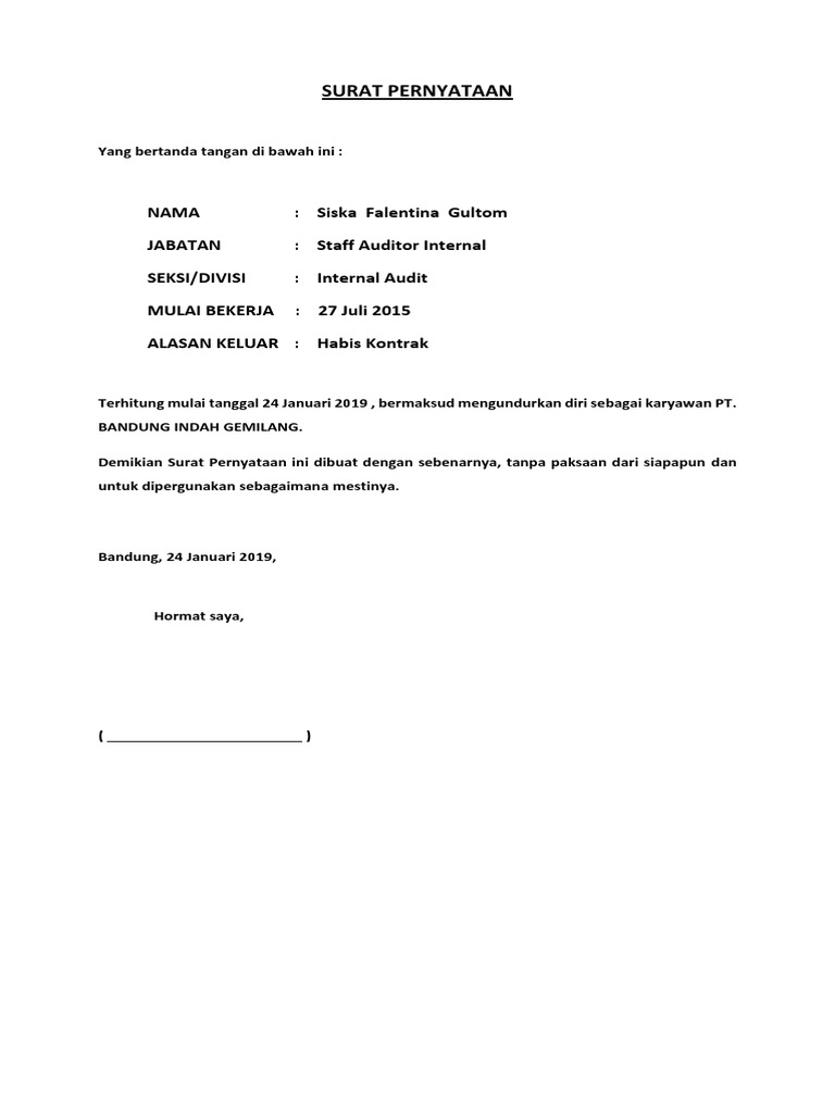 Atau mungkin memerlukan suatu rekomendasi terlampir dari pihak tertentu juga perlu surat pernyataan. Surat pengunduran diri atau surat resign adalah surat yang bertujuan untuk memberitahu atasan bahwa kamu ingin berhenti bekerja di situ secara resmi. Asalkan kamu sudah tahu format contoh suratnya dan hal yang perlu diperhatikan dalam membuat surat pernyataan hutang atau cicilan hutang. Surat pengunduran diri adalah surat yang dibuat oleh seseorang untuk ditujukan kepada pihak perusahaan tempatnya bekerja dengan maksud untuk memberikan pernyataan bahwa si pembuat telah memutuskan untuk mengakhiri masa kerjanya di perusahaan atau instansi tersebut. Contoh surat pernyataan diri dan tips membuatnya dengan baik, surat pernyataan diri kesehatan, menikah, menjual barang langsung saja neh buat kamu yang membutuhkan keikut sertaan kalian bisa dalam bentik doc word atau di ketik tangan dengan matrai dan sifatnya mengikat satu sama lain. Apabila melanggar atau pernyataan ini tidak benar saya siap dituntut sesuai dengan hukum yang berlaku. Surat pernyataan ini mempunyai banyak kegunaan, seperti halnya untuk surat pernyataan belum menikah, surat pernyataan sanggup memmatuhi aturan, surat pernyataan kerja, dan juga masih untuk mendownload contoh surat pernyataan diri dalam format.doc silahkan klik link berikut ini Bagi anda yang berminat, anda dapat mendownload contoh format doc (word) atau pdf. Makanya dalam dunia perdokumenan dan surat menyurat. Contoh surat pengunduran diri yang berformat doc bisa di edit pada software microsoft office versi lama ataupun baru dan di cetak untuk dikirimkan. Anda juga bisa mencari di search engine lainnya. Dan bagaimana contoh surat pernyataan diri sendiri yang baik dan benar itu? Tidak hanya orang pribadi, surat pernyataan juga dibutuhkan organisasi, perusahaan besar, atau pemilik.